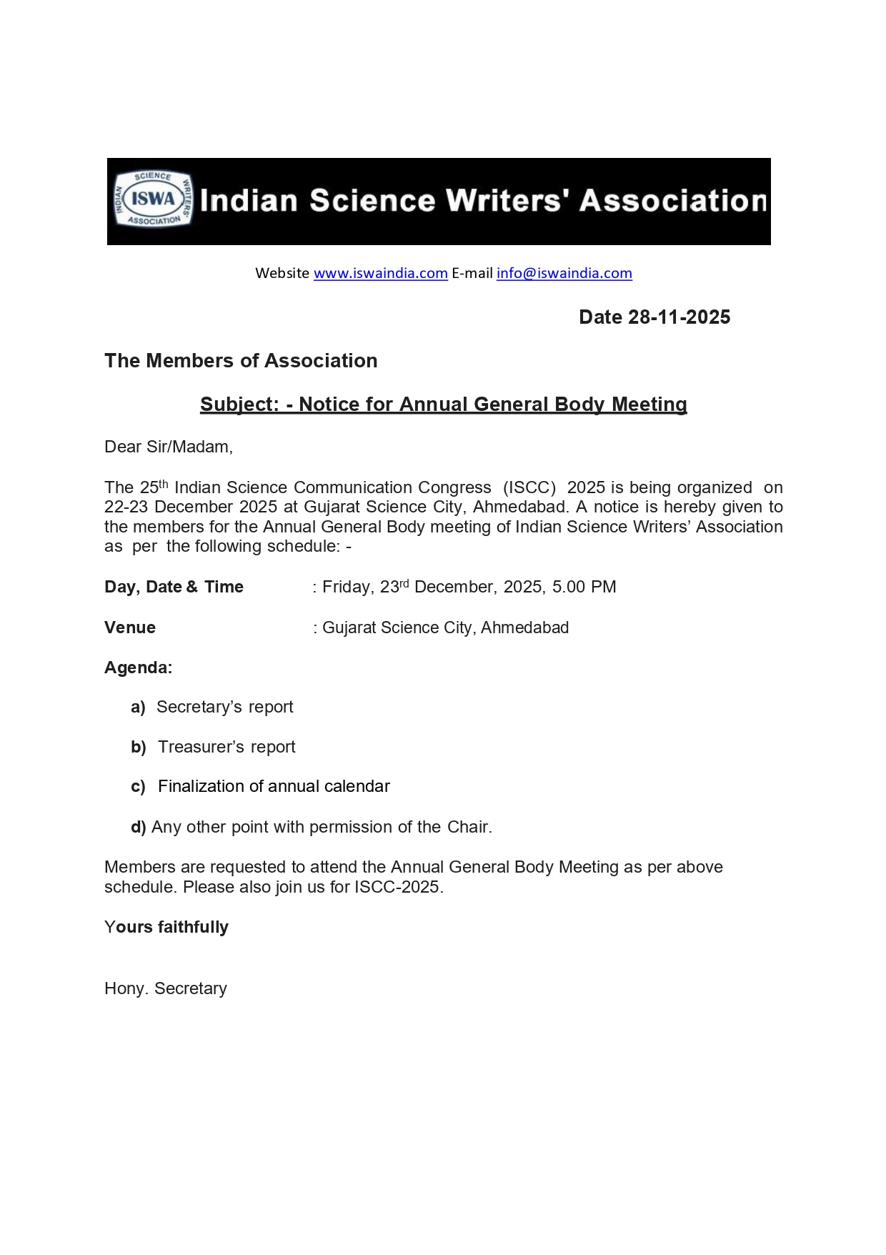 December 17, 2025 Off Annual General Body Meeting of ISWA will be held on Tuesday, 23rd December, 2025, 5.00 PM ISWA AGM Notice – Click here to DownloadDownload Post navigation Previous PostPrevious Science Communication Conference On Public Understanding of Quantum Science & TechnologyNext PostNext Souvenir of Science Communication Conference On Public Understanding of Quantum Science & Technology